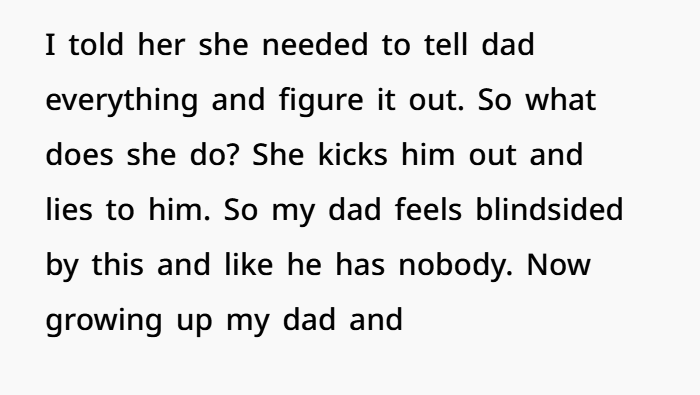 But this situation just got worse. Instead of being honest, my mom kicked my dad out of the house and lied to him about what happened. He was completely blindsided by it and felt like no one was on his side. Now, my dad and I didn’t have the best relationship growing up, but during this time, he really needed someone to lean on. I was there for him, even though my mom was just starting fights over the most ridiculous things.