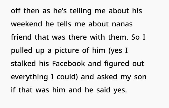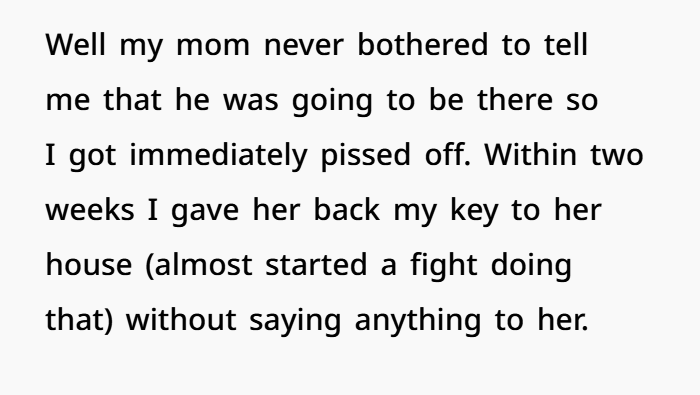 By this summer, things were starting to hit a breaking point. My mom asked if she could take my son for the weekend to an amusement park, which I agreed to. But when my son came back, he told me about this “friend” of Nana’s who was with them, someone I never heard about. So, of course, I got pissed off. My mom had never mentioned this guy was coming. After some stalking on Facebook, I found out who he was, and let’s just say my trust in my mom hit an all-time low. I had enough. I took back my key to her house, which honestly nearly turned into a huge fight. But I had to do it—I couldn’t keep letting this go on.