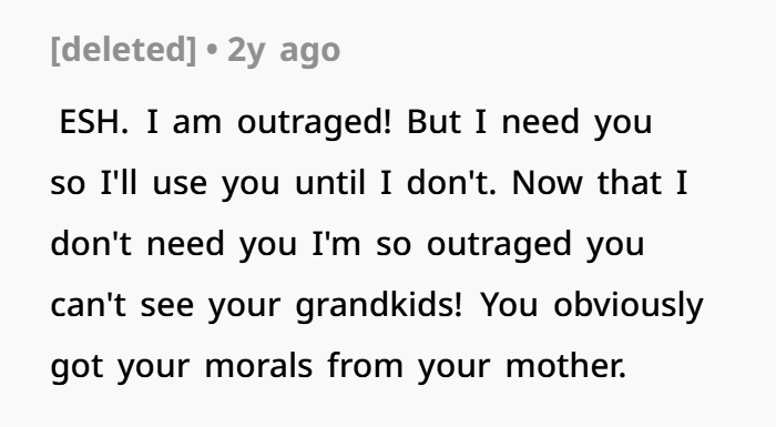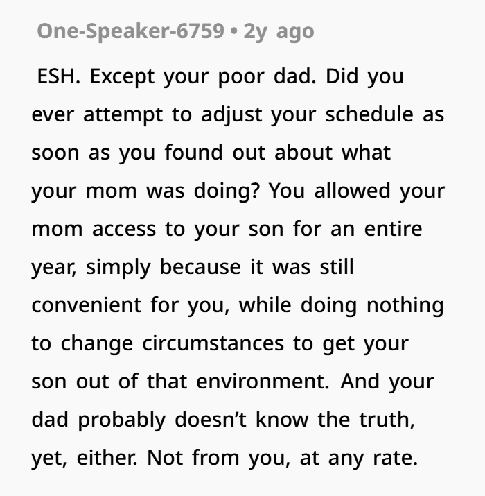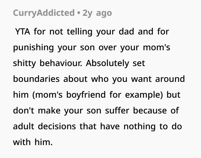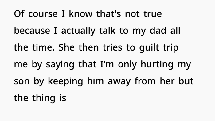 So, my question is, AITA for telling my mom she won’t see my son again? I’m doing this to protect him, but it’s hard because she’s still family. Should I just let it go and let her back into our lives? Or am I right in keeping my distance to protect my family from more hurt?