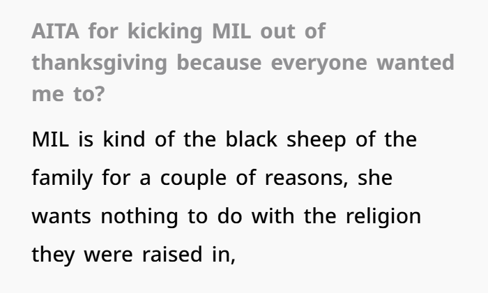 I (F30s) recently hosted my first Thanksgiving dinner, and everything was going smoothly until my mother-in-law (MIL) joined the table. The family has a history with her being the “black sheep,” and things got tense quickly. It all started with a discussion about a past family drama, and before I knew it, my MIL was being berated by almost everyone at the table. Eventually, I asked her to leave, as the majority of my guests wanted her gone. I thought I was just trying to save the evening, but now I’m being called a “fake” and “coward” by her and my father-in-law. Was I in the wrong for kicking her out?