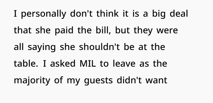 Was I wrong for asking her to leave? Should I have let the situation play out and allowed the drama to continue? I know MIL is tough to deal with, and her family’s treatment of her isn’t always kind, but at the end of the day, it was my house, and I didn’t want to let one person ruin the evening for everyone else.