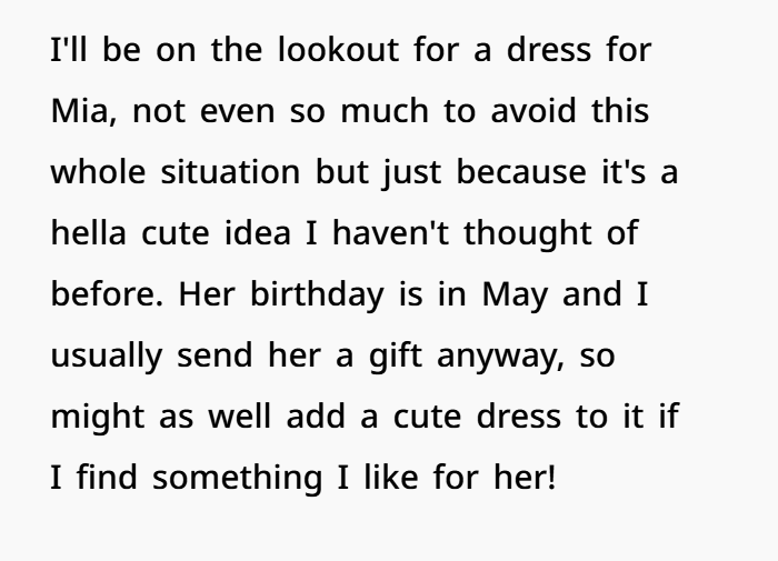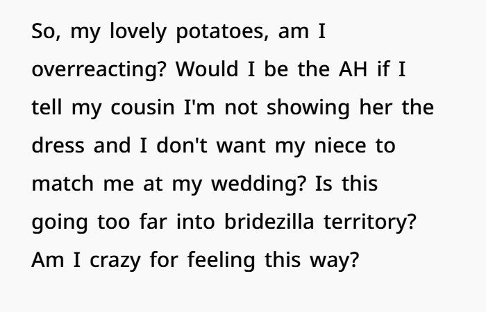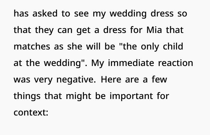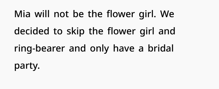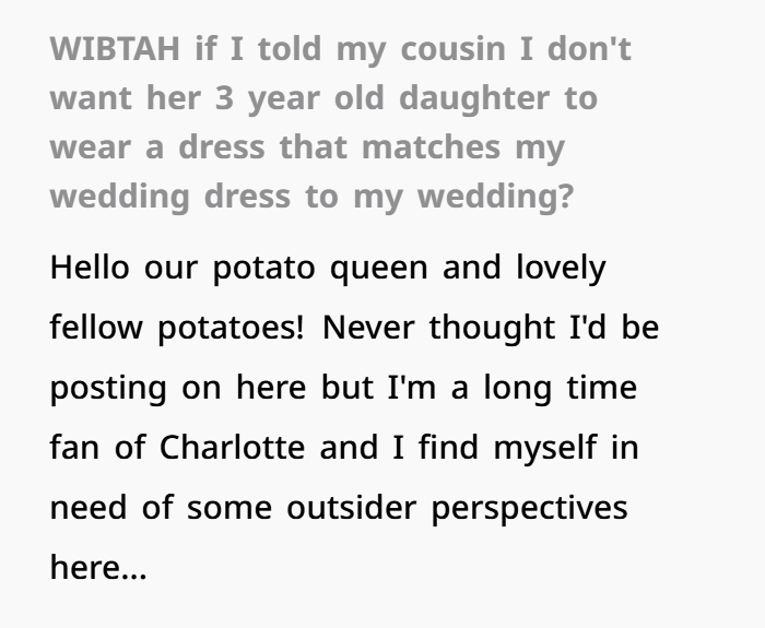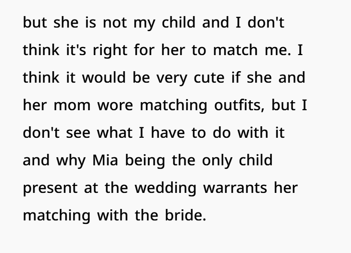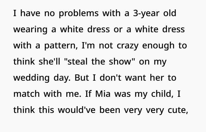 Letting a child wear something cute but not identical to your dress ensures they still feel involved without taking away from your big day. Be kind but firm in explaining your wishes to family, and don’t forget: it’s your day, and you have every right to make it your own.