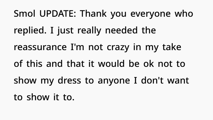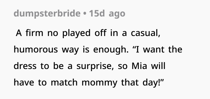 Another important point to remember is that there’s no need to feel guilty about standing your ground. It’s okay to politely refuse a request, even if it comes from a place of good intentions. If someone asks to see your dress ahead of time or asks to match a child’s outfit to yours, you can politely say, “I’m really keeping the dress a surprise for the day of, but I would love to help pick out something for Mia that’s just as cute.” That way, you’re still being considerate, but also standing firm on your wishes.