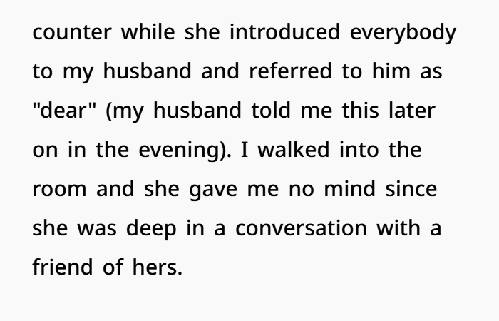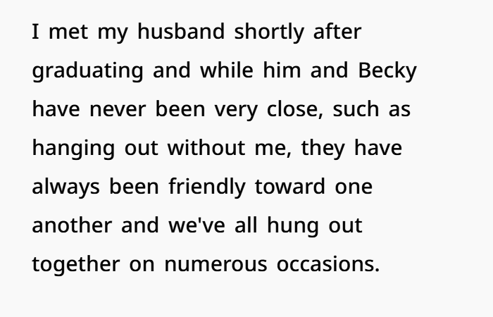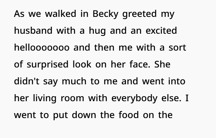 We showed up at the BBQ, and Becky greeted my husband with this huge excited hug while I was just… kind of sidelined. She didn’t say much to me, so I went to put down the food we brought. Becky was all over my husband, referring to him as “dear” and introducing him around like they were best friends. I didn’t think much of it at first, but I started to feel weird when it seemed like she was ignoring me.