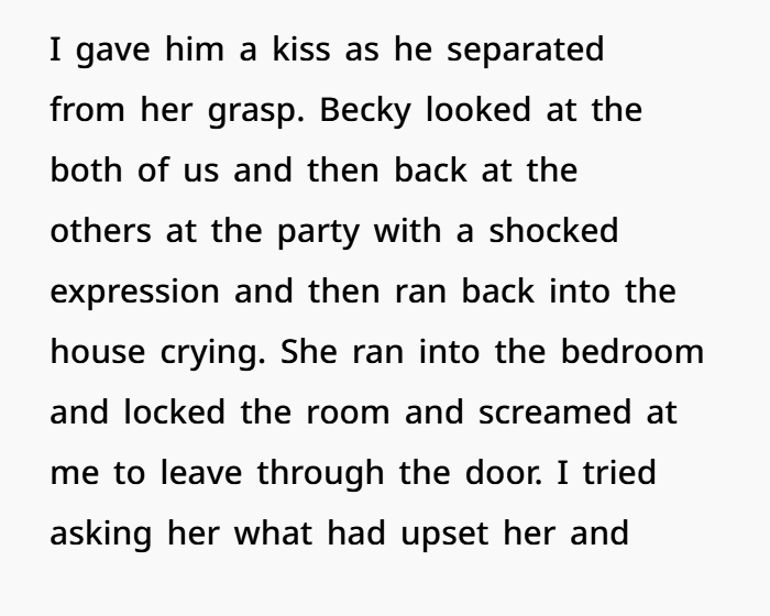 At some point, my husband and Becky were standing by the patio door, and she had her arm around his waist. I saw my husband look at me with a “help me” look, and I just felt awkward. So, I did what any wife would do—I went up to him and kissed him lightly. Becky immediately looked at us, then at the other guests, and her face went from surprise to shock in a split second. Without saying a word, she ran into the house, locked herself in a bedroom, and started crying.