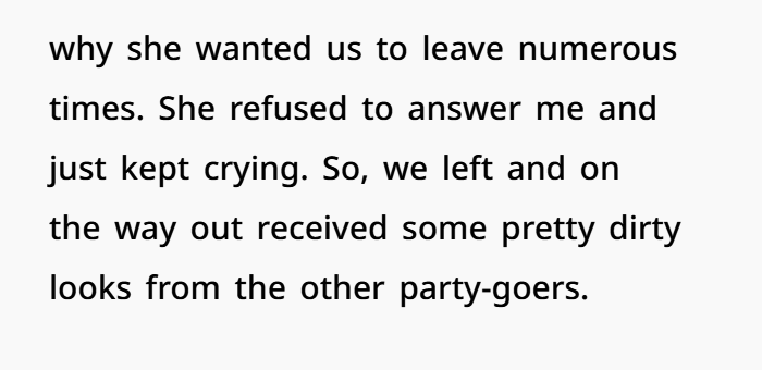 She screamed at me to leave, and even though I asked her repeatedly why, she just kept sobbing and refused to answer. Eventually, we left, but on the way out, we got some dirty looks from other guests. I had no idea what had just happened.