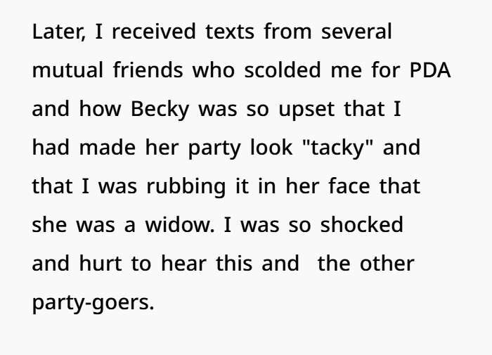 Later that night, I got texts from mutual friends telling me I made a huge mistake. They scolded me for being too affectionate in front of Becky, saying it was inappropriate for a widow’s event and that I was making her feel worse. I was floored. To be honest, I thought it was a very innocent kiss. It was just a side hug and a peck, no big deal, right? Apparently, it was.