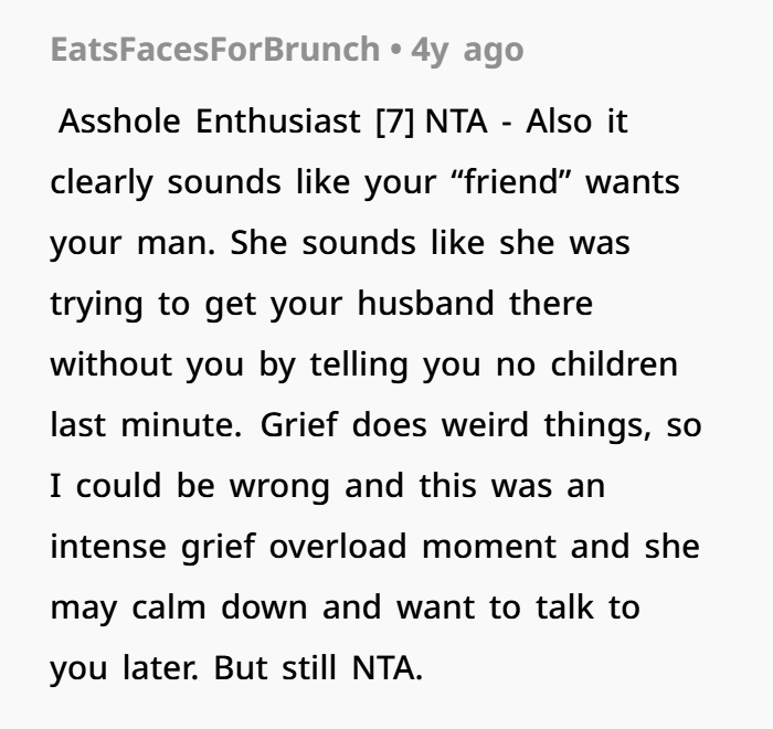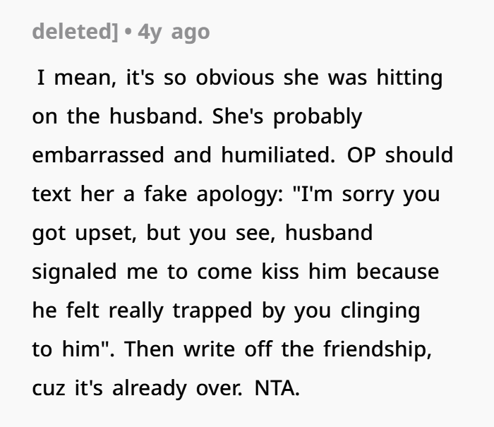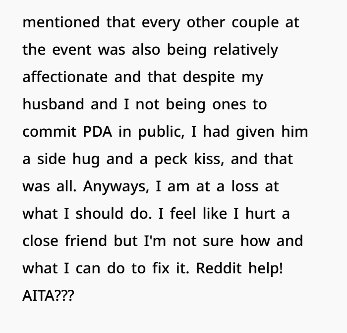A woman wonders if she made a mistake by kissing her husband at a close friend’s event. Her friend, a recent widow, was upset by the PDA, causing a scene at the party. Now, she’s questioning if she did something wrong, especially after receiving backlash from other guests.