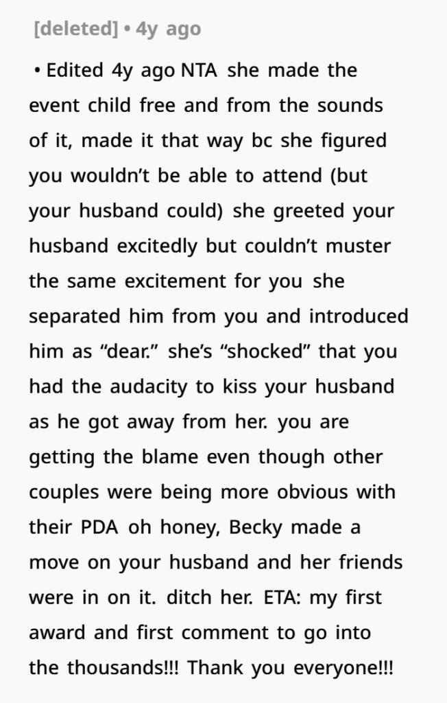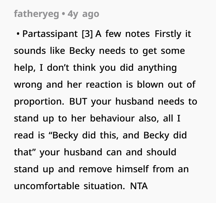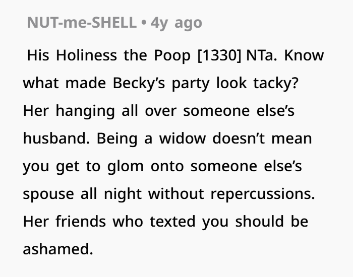At the end of the day, I love Becky, and I don’t want to cause any more pain in her life. But am I really the a**hole here for showing a little affection to my husband at a party?