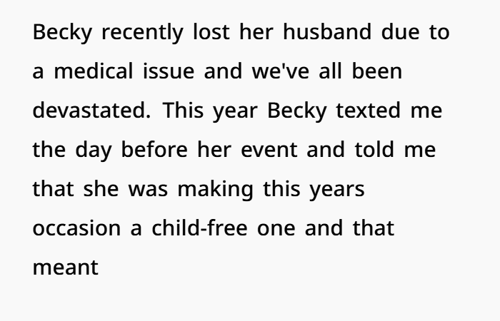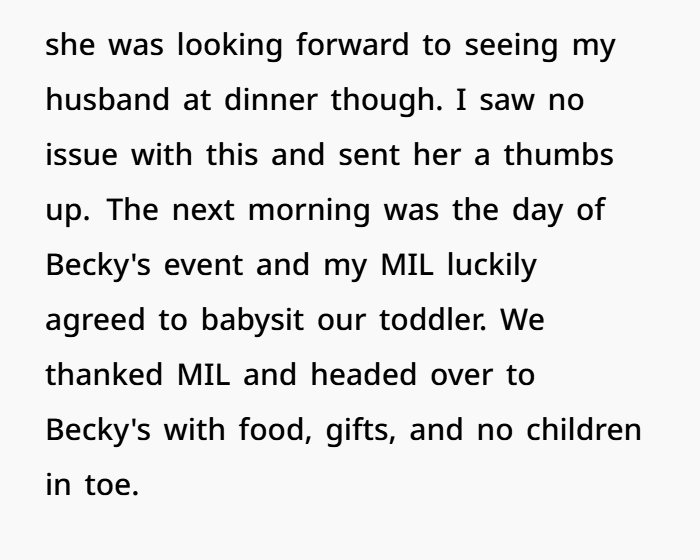 Okay, so here’s the situation: I (F37) and my husband (M42) went to my friend Becky’s (F36) annual BBQ last weekend. We’ve been close friends since college, and even though my husband and Becky have never been best buds, they’ve always gotten along well. This year, Becky decided to make the event child-free, so I had to leave my toddler at home with my MIL.