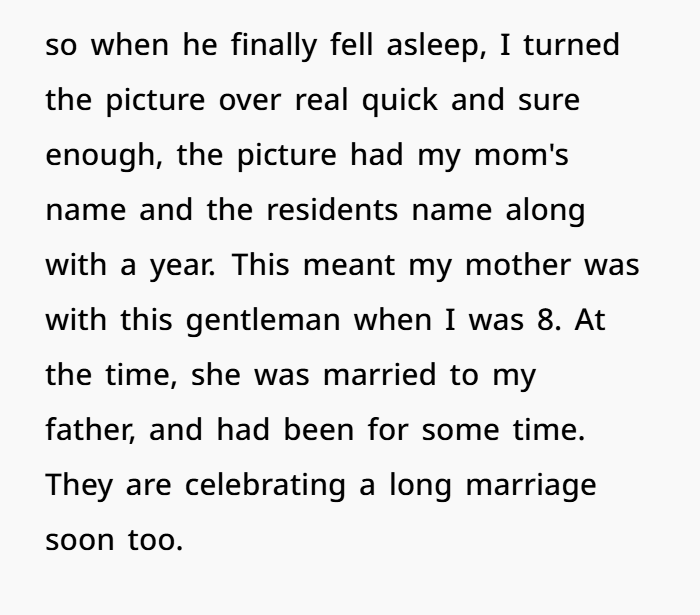 Let’s slow this down, because this kind of discovery messes with your head in ways you don’t expect. Finding out a parent had an affair isn’t just about them. It hits your identity. Your childhood. The story you thought you grew up inside. And when you find evidence inside an assisted living facility, while working in healthcare, it adds another layer of emotional stress.