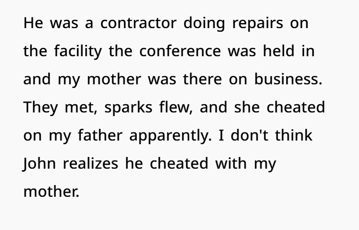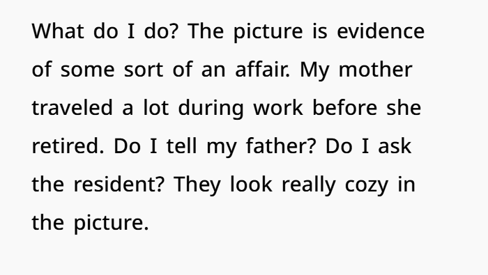 Confronting his mother privately could provide context. Maybe the marriage was struggling at that time. Maybe his father knows already. That’s more common than people think. Sometimes couples quietly rebuild without telling children.