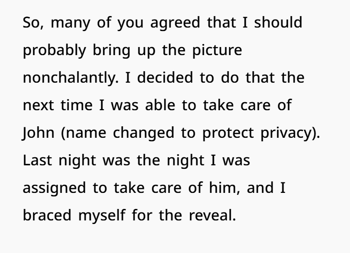 If confronted harshly, it could emotionally destabilize him. Healthcare ethics prioritize patient well-being. As a caregiver, maintaining professional boundaries is critical. He can’t ethically interrogate a resident for personal closure.