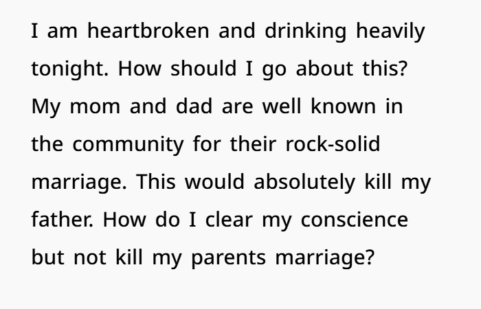 From a relationship advice standpoint, honesty is generally encouraged in marriages. Transparency builds trust. But this isn’t his marriage. It’s his parents’. And the affair happened over a decade ago.
