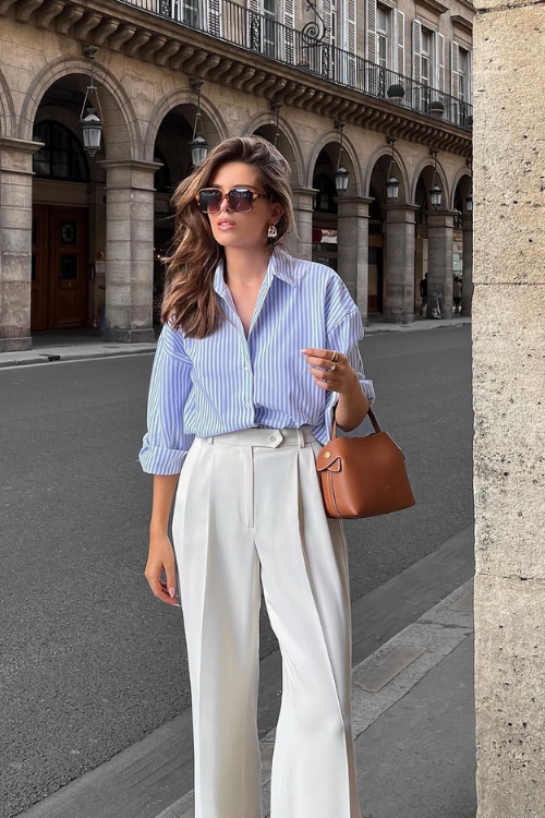 Nothing screams old money outfit aesthetic like an oversized striped shirt tucked into tailored trousers. It’s simple but screams luxury. Pair it with a structured designer handbag and kitten heels for that Hamptons-chic vibe.