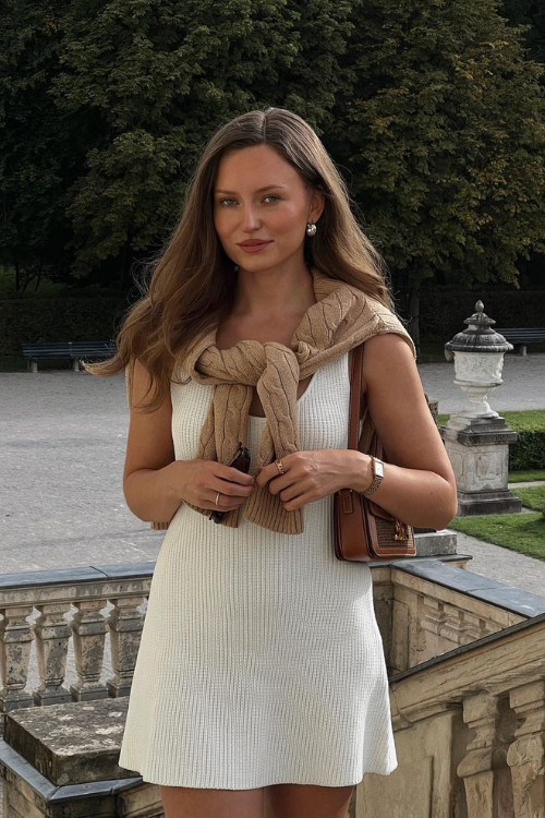 A cozy neutral sweater layered over a crisp white shirt is the definition of old money style clothing. Add tailored trousers, loafers, and a leather tote for an effortless yet elegant look.