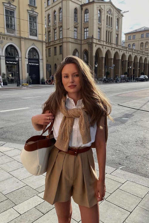 This one’s pure old money summer aesthetic. A crisp linen shirt with pleated shorts keeps things light, while a sweater casually draped over the shoulders adds elegance.