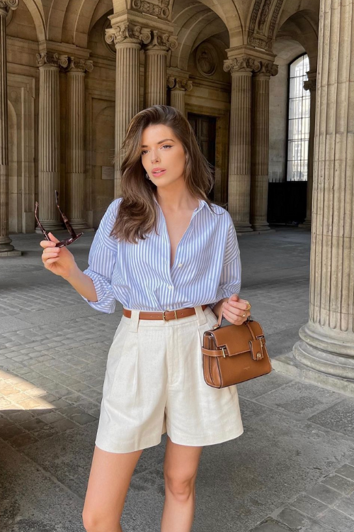 Stripes never go out of style. An oversized striped shirt tucked into linen shorts = summer luxury done right. Think yacht parties or seaside lunches.