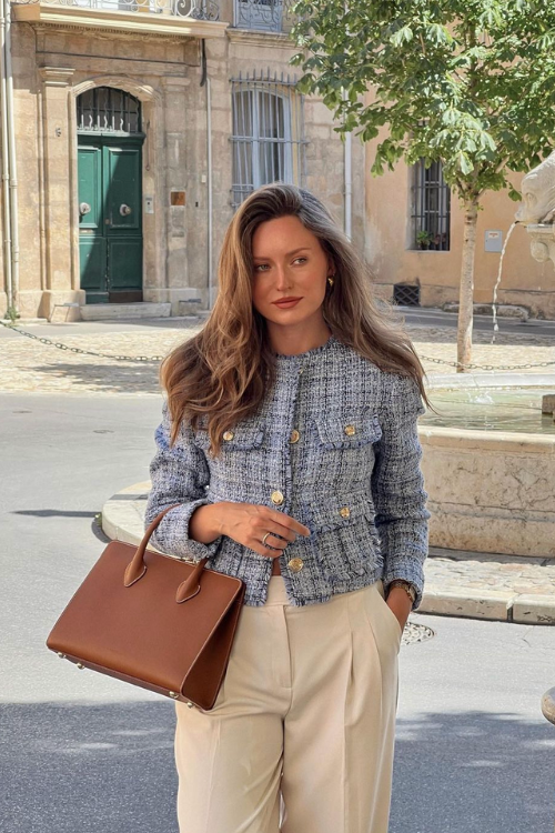 💡 Style Tip: Keep accessories neutral and understated so the tweed is the star.
