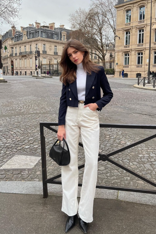 A sleek high-neck with a cropped blazer and fitted jeans makes a modern old money street style look. Add a slim belt and heels to seal the deal.