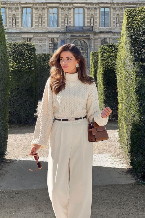 Nothing says wealth like a head-to-toe monochrome outfit. A neutral high-neck sweater with matching pants gives you that understated, rich-girl look. Add a pearl necklace for instant timeless chic.