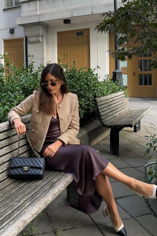 💡 Style Tip: Tweed + slip dress = timeless power combo. Keep accessories minimal but refined.