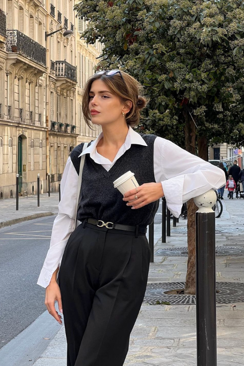 This look blends cozy and classy. Throw a knit vest over a crisp oversized shirt and tailored trousers for casual old money chic. Pair with flats or oxford shoes and finish with a leather handbag.