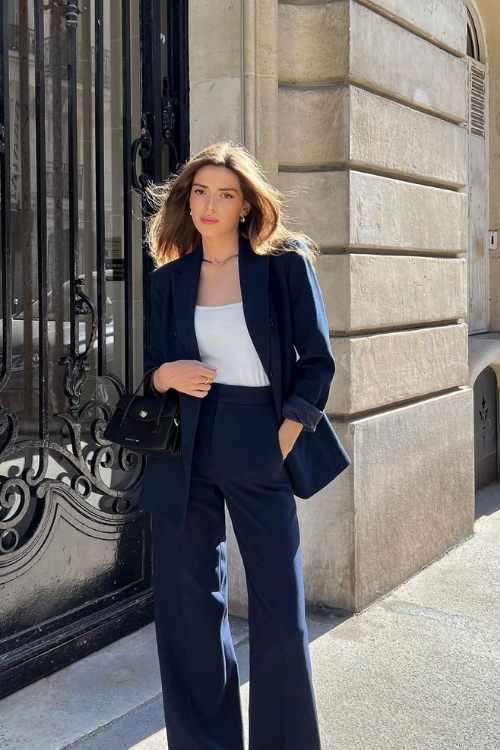 A tailored pantsuit is the ultimate old money power outfit. Go for a fitted blazer with matching trousers, add a silk blouse, pointed-toe pumps, and of course—a designer handbag to seal the look.
