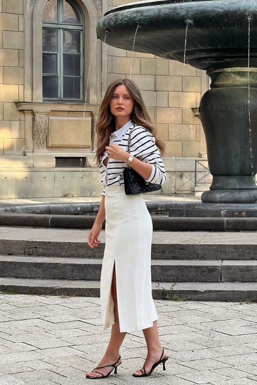This Hamptons-inspired look is perfect for lunch dates. A striped tank tucked into a flowy midi skirt is casual yet polished.