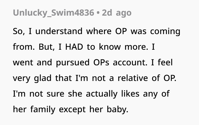 I thought maybe she was getting the message, especially after we mentioned it a few times. But then came Christmas. This year, she “gifted” us all a week-long family vacation in a ski town in May. The catch? She had already booked everything, including accommodations, and expected us to just show up. The trip is six hours away from us, but closer for her and my BIL and SIL. The dates, of course, were picked without consulting us, and she picked it specifically because it’s before I go back to work after maternity leave.
