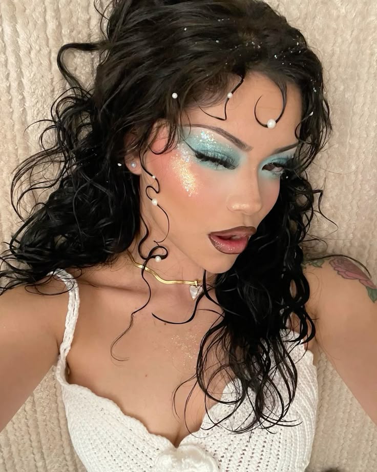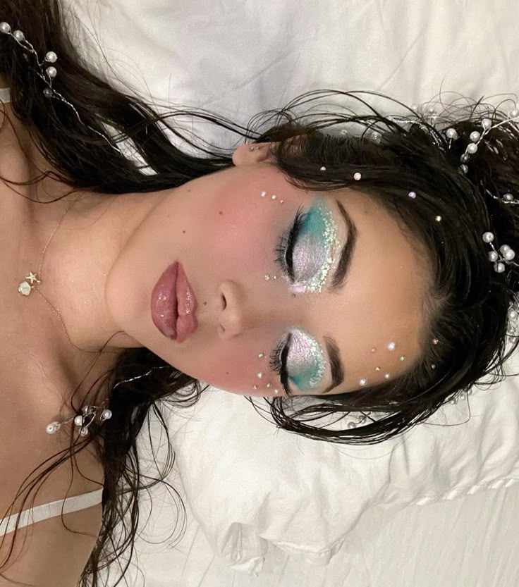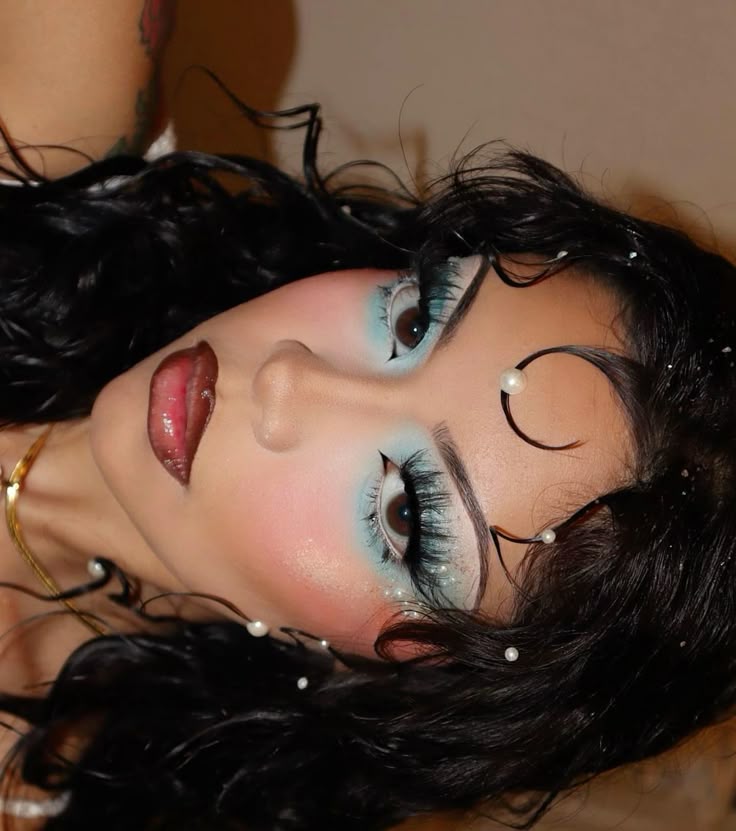 This shimmering blue eyeshadow with delicate pearl accents gives total mermaid-core energy. It’s soft, dreamy, and so ethereal. The glossy lips and dewy skin add that extra glow, making the whole look feel magical and fresh. Perfect if you’re into underwater-inspired makeup or just want a bold, glam eyeshadow look that turns heads.