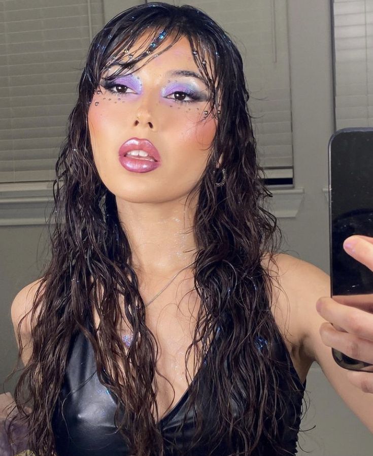 There’s something hypnotic about this iridescent purple eyeshadow look — it’s soft, shimmery, and just magical. The glossy lips and glowy skin add that ethereal touch that screams siren energy. Perfect for nights out or when you wanna stand out with mystical glam makeup. Seriously, this one’s giving main character vibes.