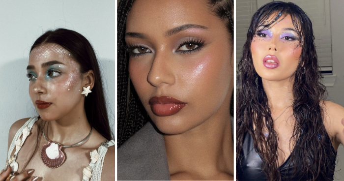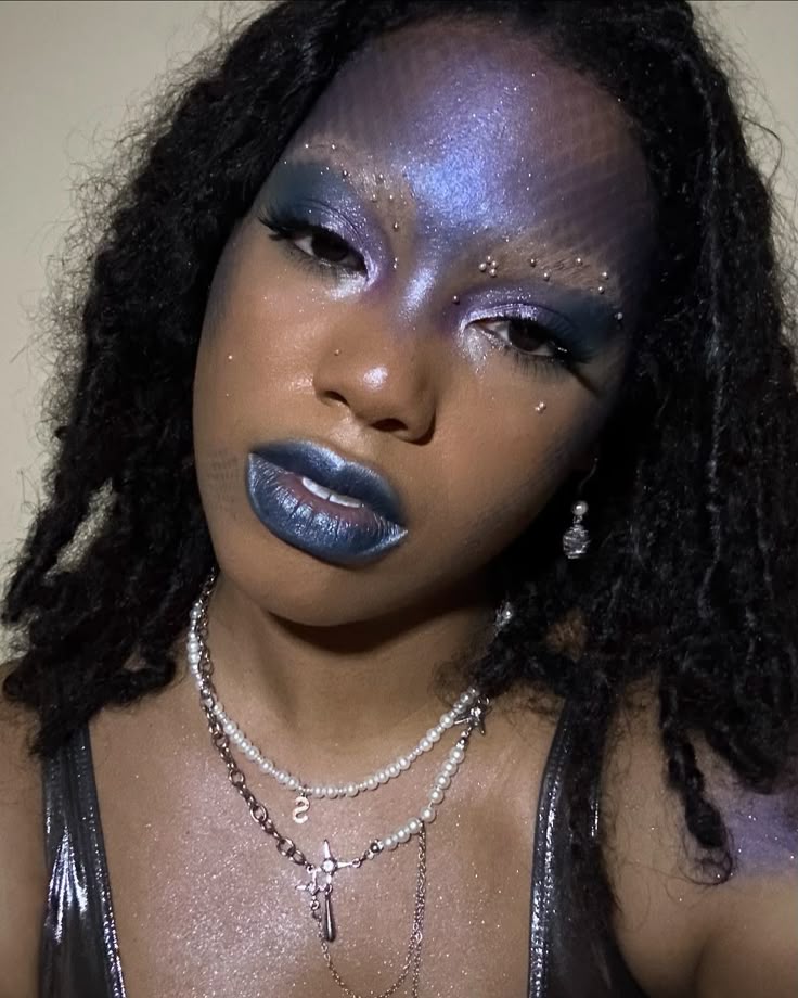 This one’s all about drama and shimmer. The mix of iridescent blues and purples creates a glittery, glowing siren look that’s straight out of a fantasy film. The bold lip color and shimmering scale-like details make it fierce and magical. Perfect for parties, photoshoots, or if you just wanna go full glam makeup mode.