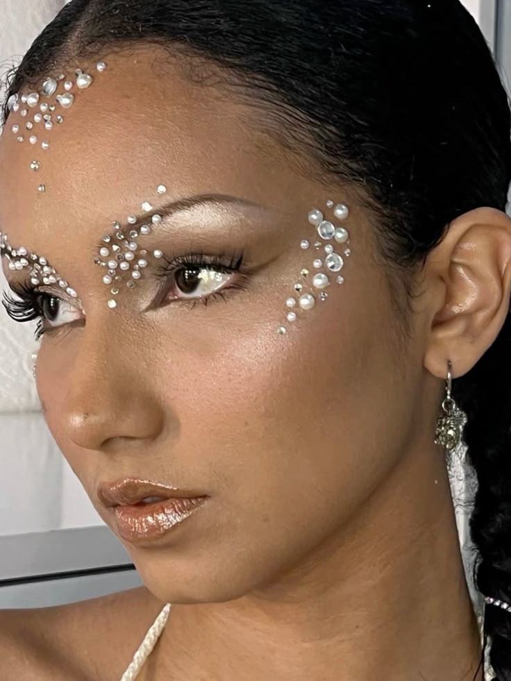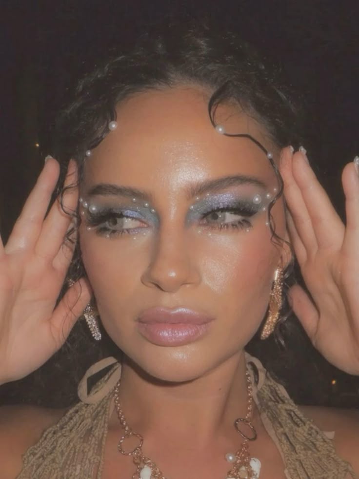 This pearl siren makeup is straight-up magical ✨ The tiny pearl accents around the eyes give that soft glam, ocean goddess vibe. I love how the shimmering eyeshadow and dewy glow make the face look radiant yet mysterious. It’s perfect for anyone who loves elegant glam makeup or wants that dreamy, underwater fantasy look.