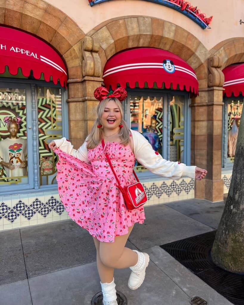 Go for a polka dot dress or skirt with Minnie vibes, then layer bike shorts underneath so you can ride everything stress-free. Pair it with white sneakers you already know won’t hurt your feet.