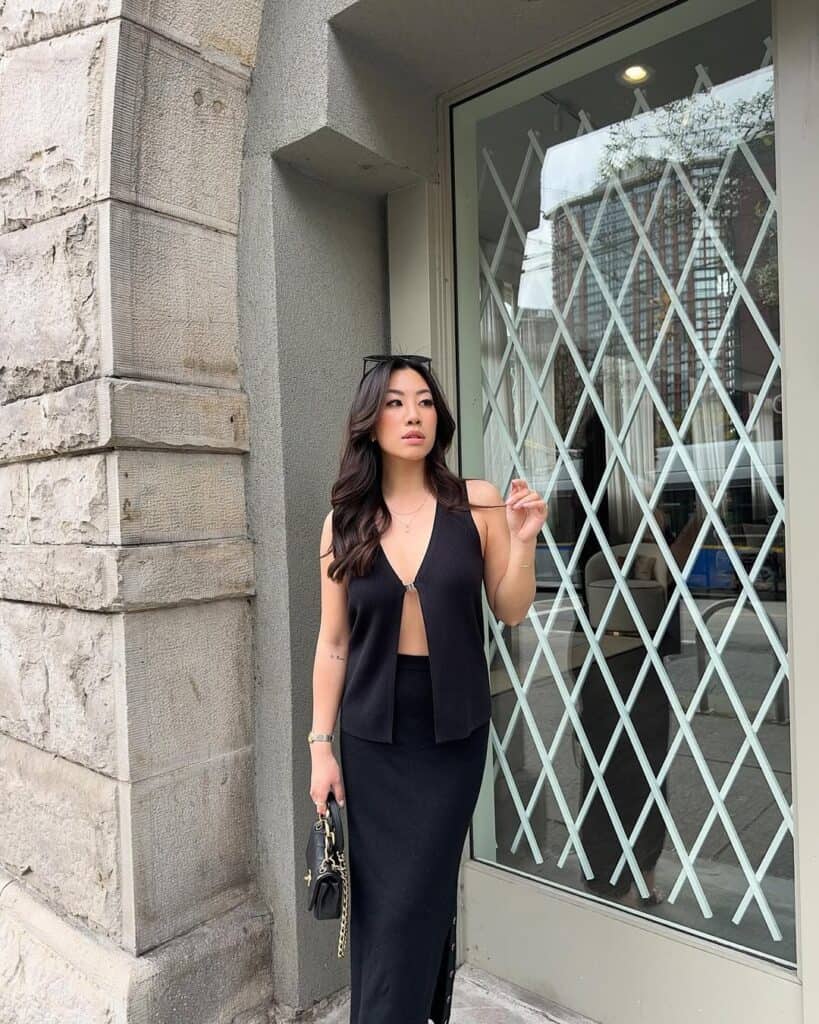 Finish with silver jewelry or a bold black bag for extra attitude. This look is mysterious, confident, and proof that black can be just as romantic as red.