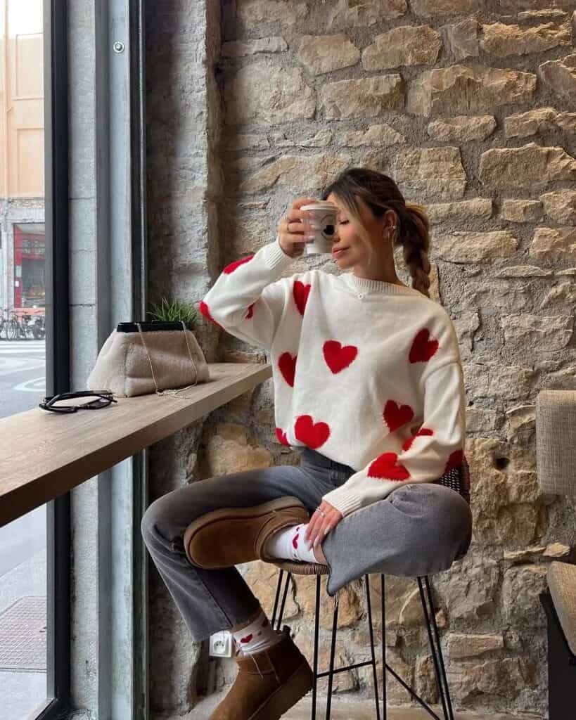 Okay, if you’re doing hearts on Valentine’s Day, let’s do it the fashion girl way — not costume vibes. A heart-print midi dress is such a cute move, or even a heart-pattern sweater styled the right way.
