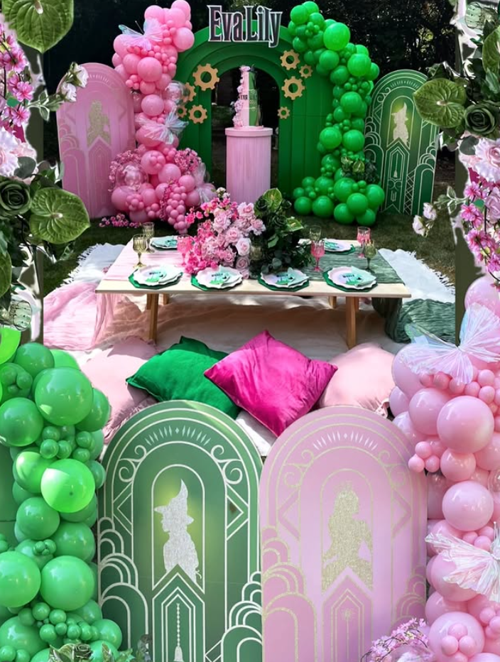 Every unforgettable Wicked birthday party starts with the decor. This is where the magic kicks in. Go all in on emerald green party decorations, black accents, shiny gold, and just a touch of pink for that Glinda-meets-Elphaba moment. It should feel dramatic, a little witchy, and kinda glamorous.