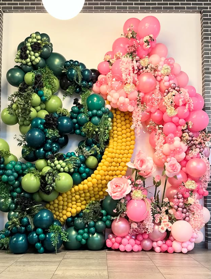 - Emerald green balloon arches mixed with gold chrome balloons
