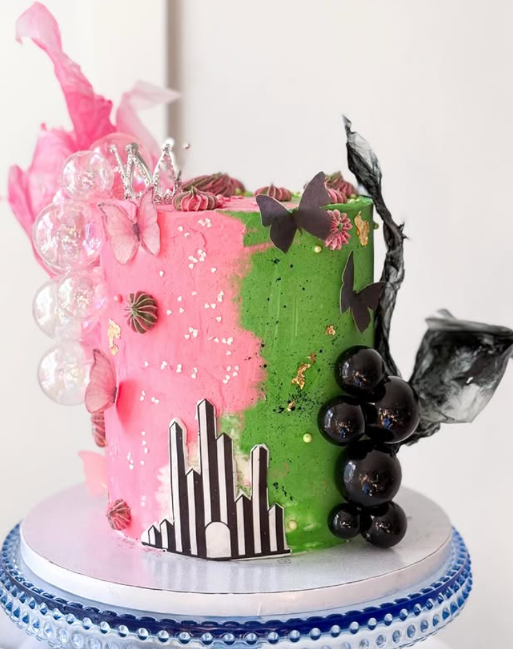 - Two-tone cakes split between green and pink for that Elphaba vs Glinda look